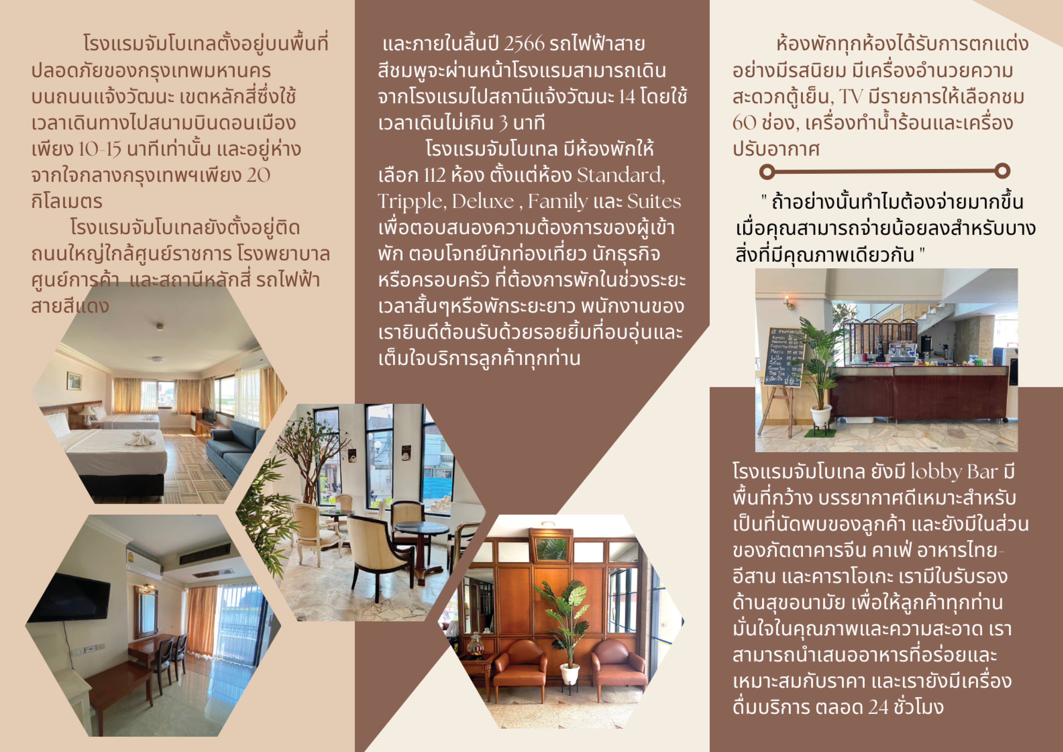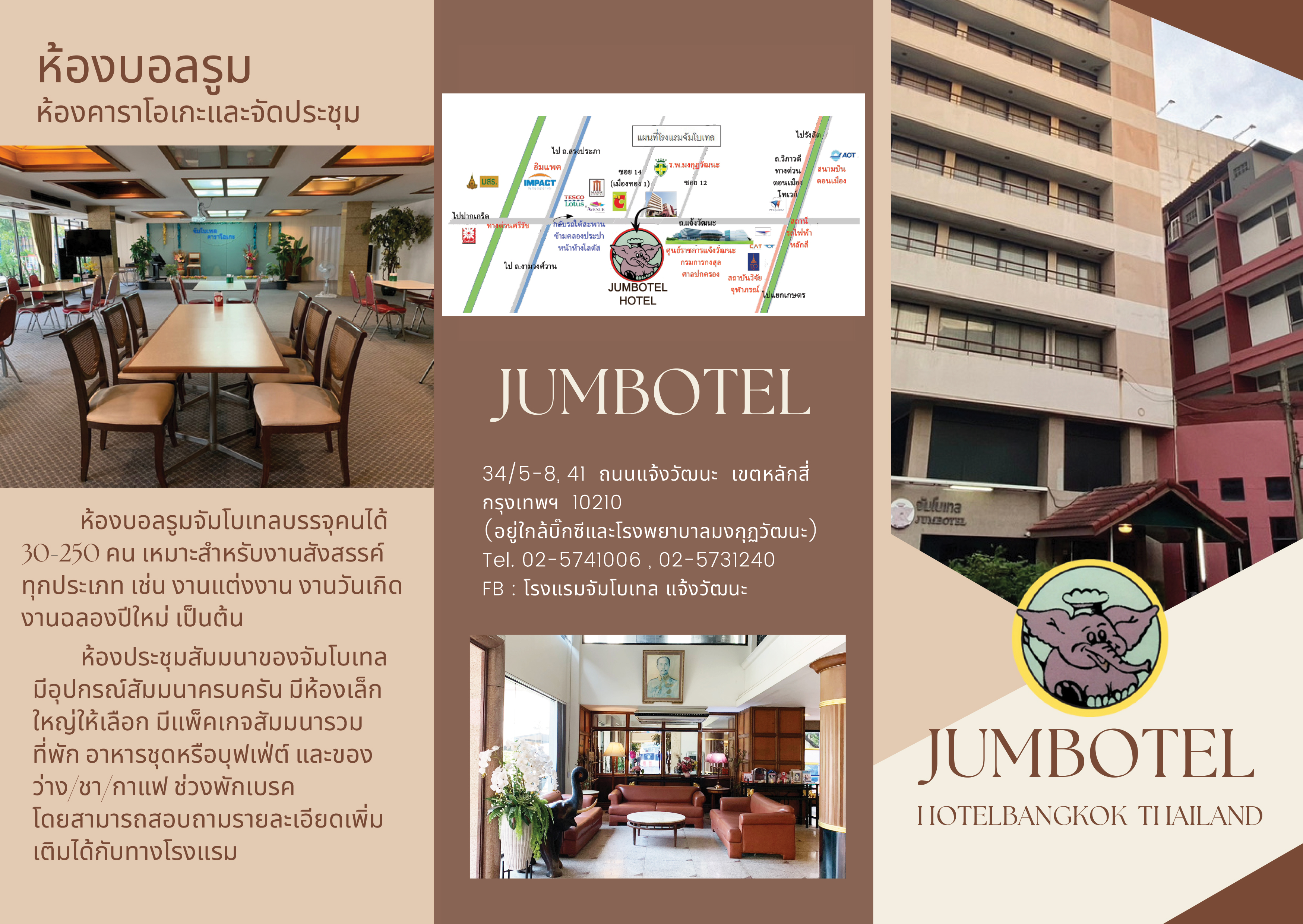 โรงแรมจัมโบเทล เป็นโรงแรมราคาประหยัด ตั้งติดถนนใหญ่แจ้งวัฒนะ ใกล้ศูนย์ราชการ ศูนย์การค้า ศูนย์แสดงสินค้าอิมแพคเมืองทองธานี และสนามบินนานาชาติดอนเมือง